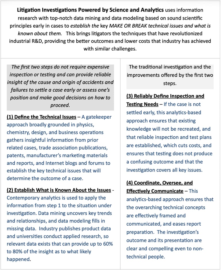 The value of using analytics in litigation investigations, especially ones that are more complex and multidisciplinary, cannot be overstated. A message from the Dean of Virginia Tech’s College of Science stated “At the Virginia Tech College of Science, we have reimagined scientific research…. We are focused not on data itself, but amplifying the relevance of that data with analysis, modeling, and interpretation.” (Va. Tech Science, Fall 2019). Testing the hypotheses made in an investigation is inherent in this approach, which is extremely valuable since testing hypotheses is an essential aspect of the scientific method that guides the normal conduct of scientific investigations and that is also fundamental in litigation-related technical investigations to meet the rules of evidence.
