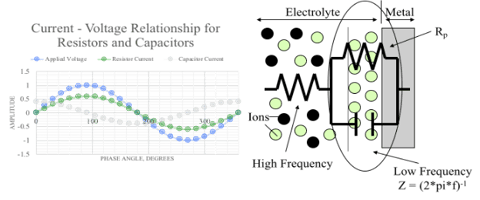 EIS involves applying an alternating voltage to a sample and this causes an alternating electric current to flow due to various electrochemical processes such as corrosion. The electrochemical processes can be modeled as an electric circuit of elements such as resistors and capacitors. The current that flows in response to the AC voltage stimulus changes in its magnitude and phase relative to the applied AC voltage as a coating takes up water and degrades, and as corrosion begins and advances.