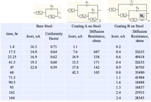 Coating A is of a type of coating that builds up with a columnar structure. The model on the right shows that a circuit element representing a diffusion process is needed and this indicates that the columns form channels that allow water and sodium and chloride ions to reach the metal, which is represented by the value of the diffusion resistance. A larger diffusion resistance indicates less penetration of water and ions to the metal, which should result in a lower corrosion rate. This coating initially provides some corrosion protection, but by allowing access of water and ions to the metal, corrosion occurs, which destroys the integrity of the coating until the corrosion rate is similar to bare steel.