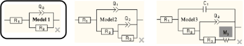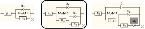 The first (left) Bare Metal Model is the simplest model and it fits the data from bare metals in salt solution. The model consists of a resistor, R1, that is in series with a parallel combination of another resistor R2 and a constant phase element, Q2. R1 represents the uncompensated resistance between the reference electrode and the working electrode (i.e. the metal specimen). R2 is the charge transfer resistance, which is inversely proportional to the flow of charge (i.e. current) at the solution – metal interface and thus R2 is inversely proportional to the corrosion rate. The final component is a capacitor, C2, or a non-linear element, Q2, that represents the double layer capacitance at the solution – metal interface.