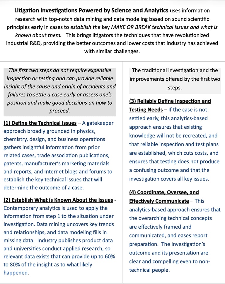 Dr. Fildes has been involved in a number of investigations that were primarily intended to resolve a dispute early without fully going through discovery, and the only difference in this case is that costly and time consuming testing is not practical or effective. Many experts have difficulty dealing with this challenge, but Dr. Fildes’ analytics based on physical chemistry approach is a natural fit. This approach, as summarized in the table above, identifies and adapts existing data to establish what could have happened and what could not have happened to cause a failure or accident. This does not usually identify the exact cause of an accident or failure but it often can limit the possibilities to a degree that is compelling to resolve a case early.